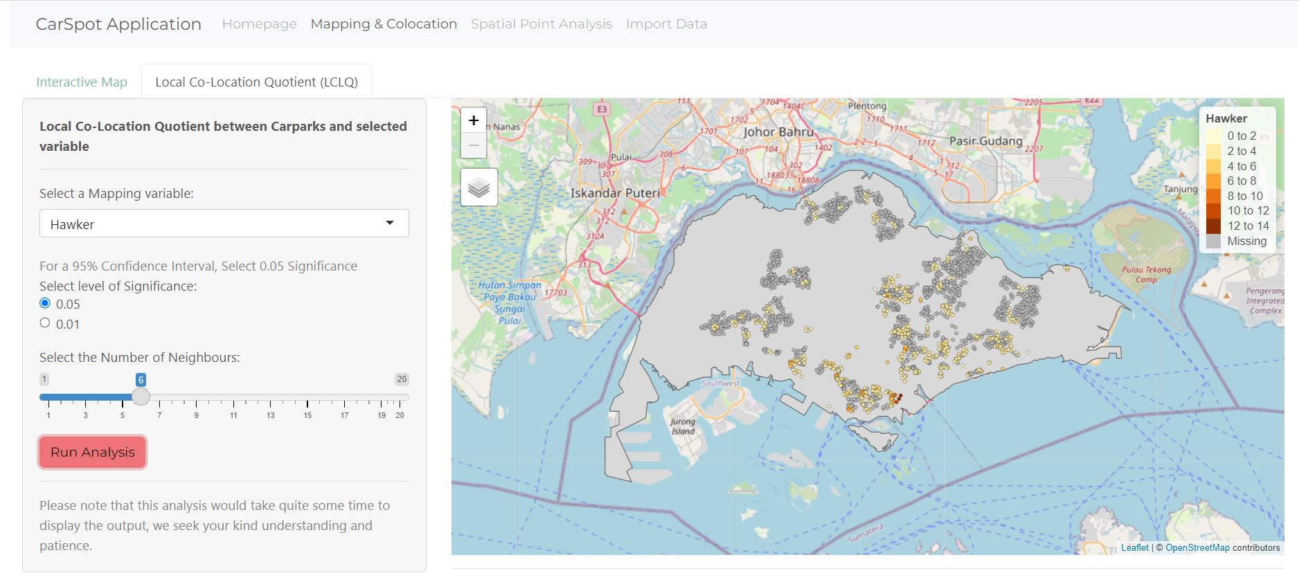 Our application enables users to derive insights from Point Pattern Analysis using Spatial Patterns Analysis and Local Co-location Quotient (LCLQ). It is helpful in uncovering whether the input data will be in regular, or clustered patterns or randomly distributed; or whether the distributions of data are dependent on each other. As for Local Colocation Quotient (LCLQ), it is useful in discovering the spatial association between HDB carparks and other interests like HDB, shopping malls and hawker centres.