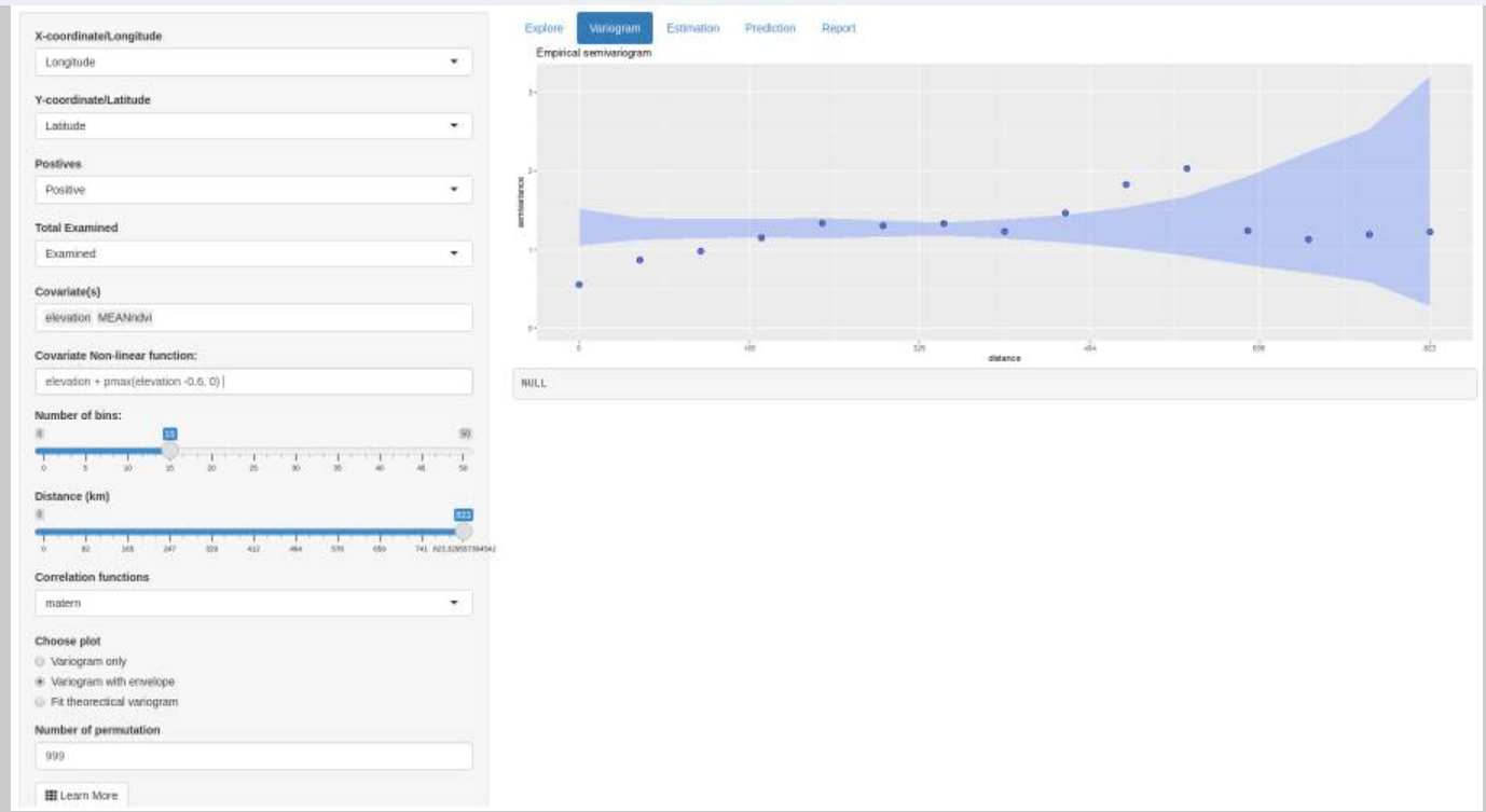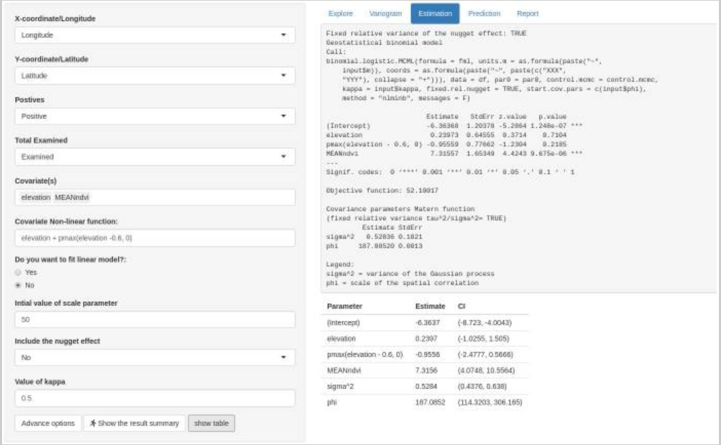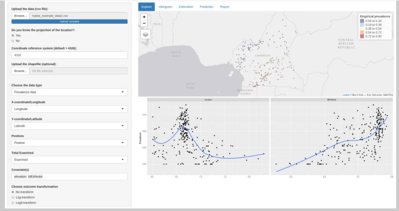 • MBGapp is a Shiny Web Application that can be used to teach the different stages of a geostatistical analysis. In this case study, they make use of the Loa loa (eyeworm) data from Cameroon to analyse its rate of infection. Through this model-based geostatistics (MBG) study, they are able to study the public health problems by using spatially discrete survey data to investigate spatial variation in disease risk.