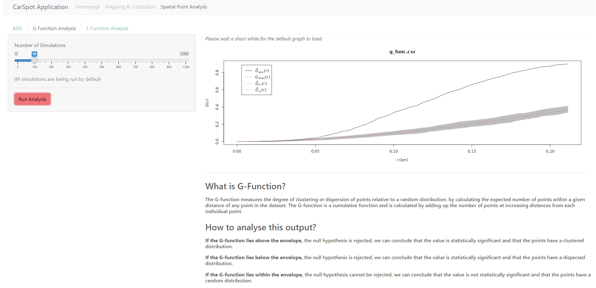 The user interface of our application is rather simple for users to use as it is rather intuitive. It also is not extremely cluttered with many different things which allows users to focus on the generated outputs. Finally, we also provided explanations on how to interpret the outputs that are simple enough for people without prior knowledge on geospatial analysis to understand. However, the disadvantage of providing simple explanations was our application was not able to educate the users further and more in-depth on point pattern analysis.