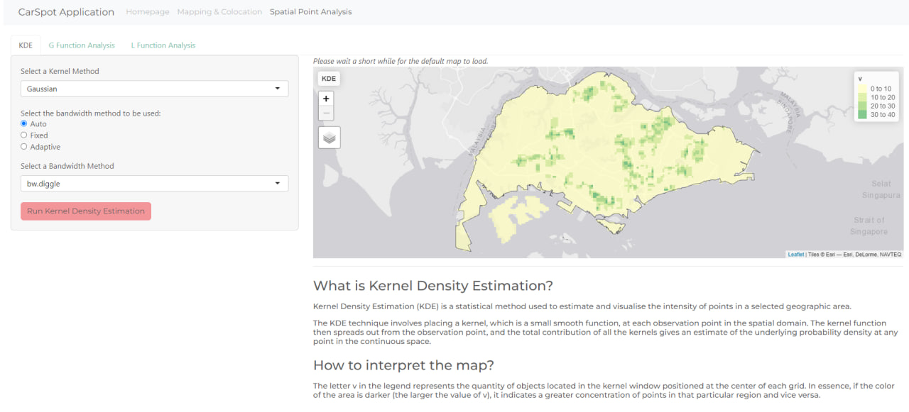 Our application will allow users to engage in Spatial Point Pattern Analysis in the local context of HDB Carparks in Singapore. As many people do not have knowledge of how to conduct point pattern analysis or programming, our application has made point pattern analysis more accessible to everyone, especially for something that affects many people in Singapore.