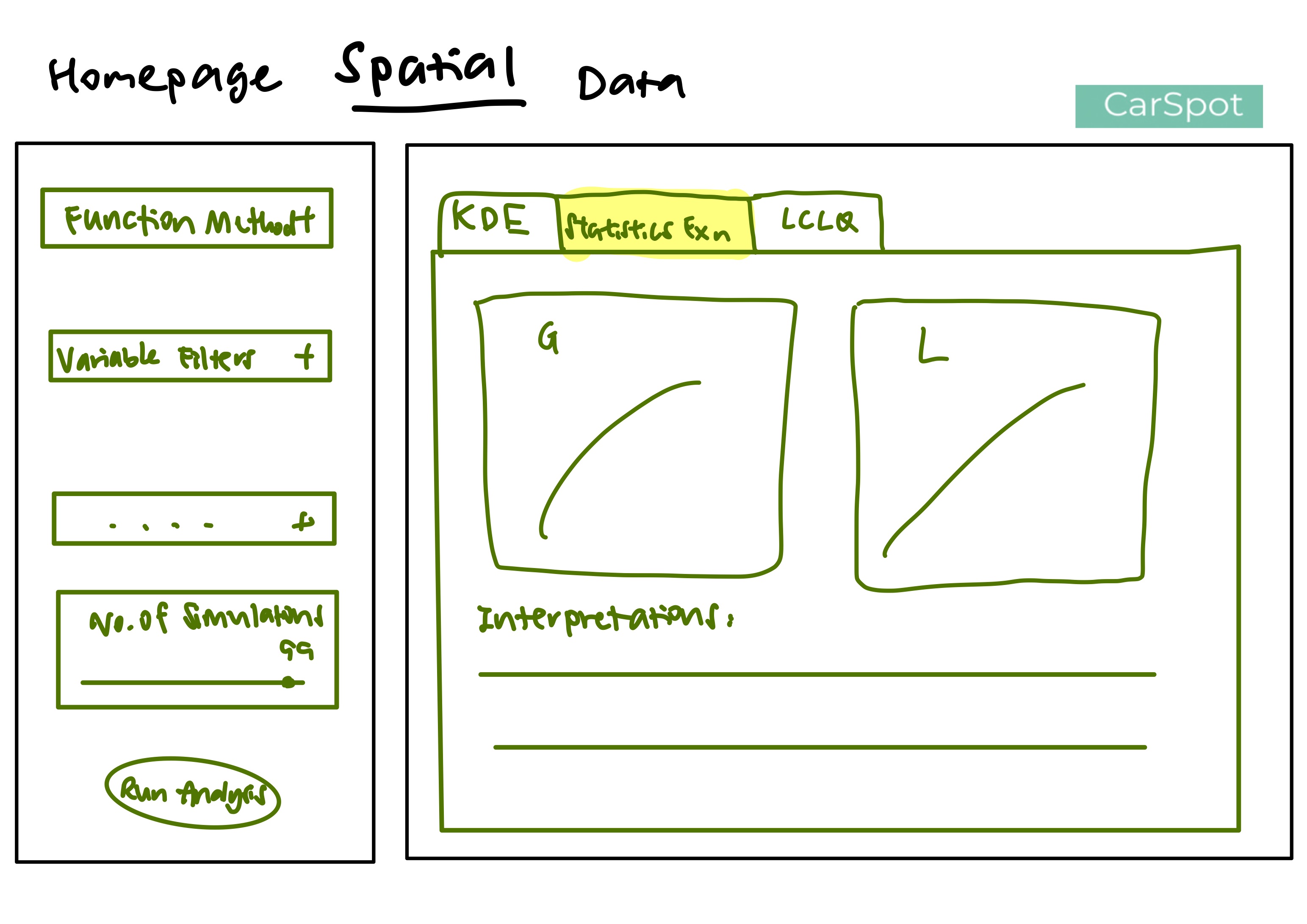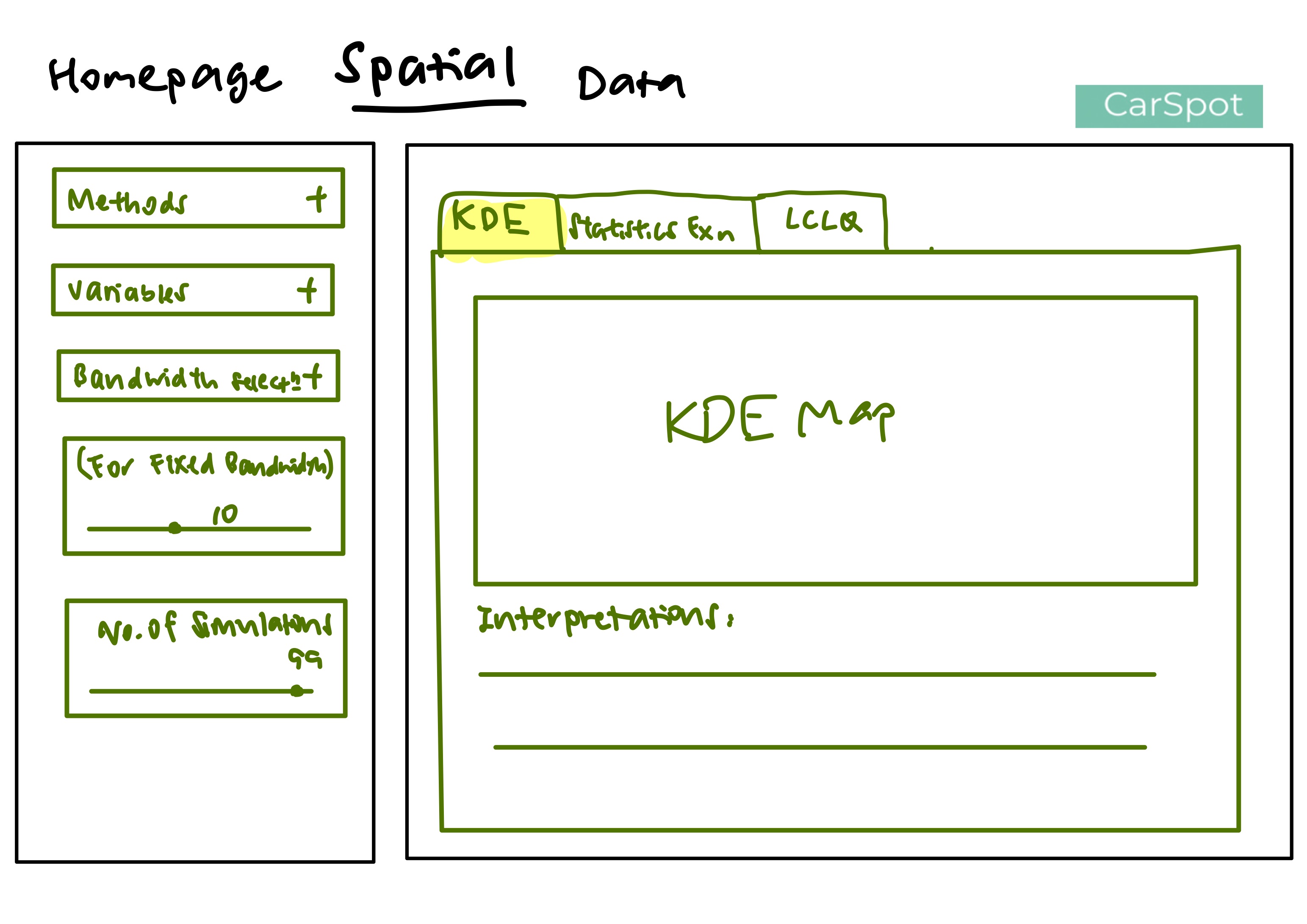 In addition, our application can generate kernel density maps using the input datasets of car parks and run a range of hypothesis tests to derive meaningful conclusions on the distributions of car parks in Singapore. To better visualise how our application would work and look like, we have storyboards to depict the proposed application UI format.